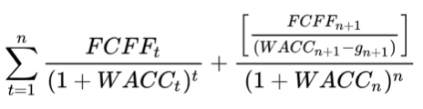 Nói chung, “Giá trị của công ty” đại diện cho giá trị doanh nghiệp của công ty (tức là giá trị thị trường của nó khác biệt với giá thị trường); đối với định giá tài chính doanh nghiệp, điều này thể hiện giá trị hiện tại ròng của dự án hoặc NPV. Thuật ngữ thứ hai thể hiện giá trị liên tục của dòng tiền trong tương lai ngoài thời hạn dự báo; ở đây áp dụng “mô hình tăng trưởng vĩnh viễn”.